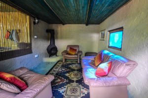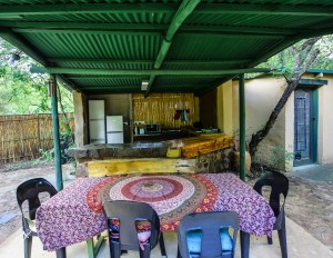 A large roofed area combines a semi open-air kitchen and dining space, perfect for cooking and enjoying meals together. The kitchen is fully equipped for self-catering, with a fridge, two-plate gas stove, microwave, kettle, and toaster. The walled lounge under the same roof provides a cosy spot to relax and socialise with a pot-bellied fireplace for those cooler evenings.